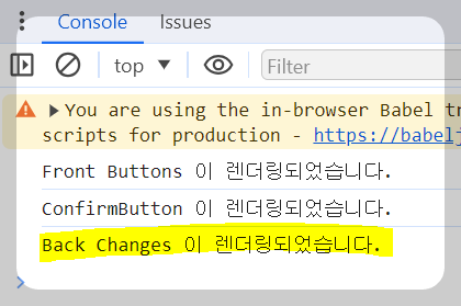 세번째와 네번째 라인을 보면 클릭시 매번 렌더링이 호출되어, 새로 컴포넌트가 그리지는것을 볼 수 있습니다.